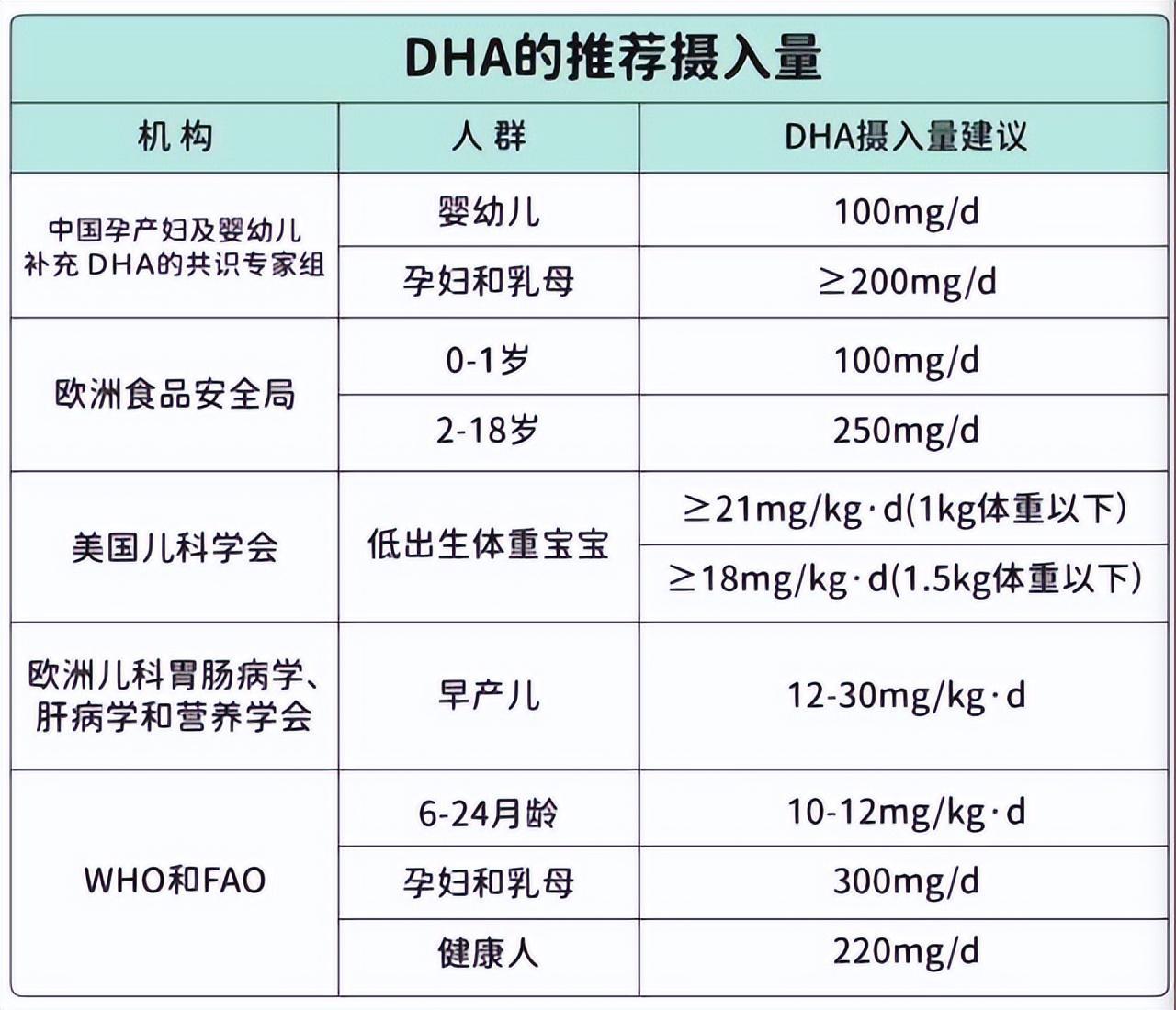 4. 看含量:補充DHA並非多多益善,不同人羣每天補多少合適?可以參考各權威機構給出的推薦攝入量(如下圖),一般DHA產品的含量也是根據指南建議來定,給孩子科學補充就好~