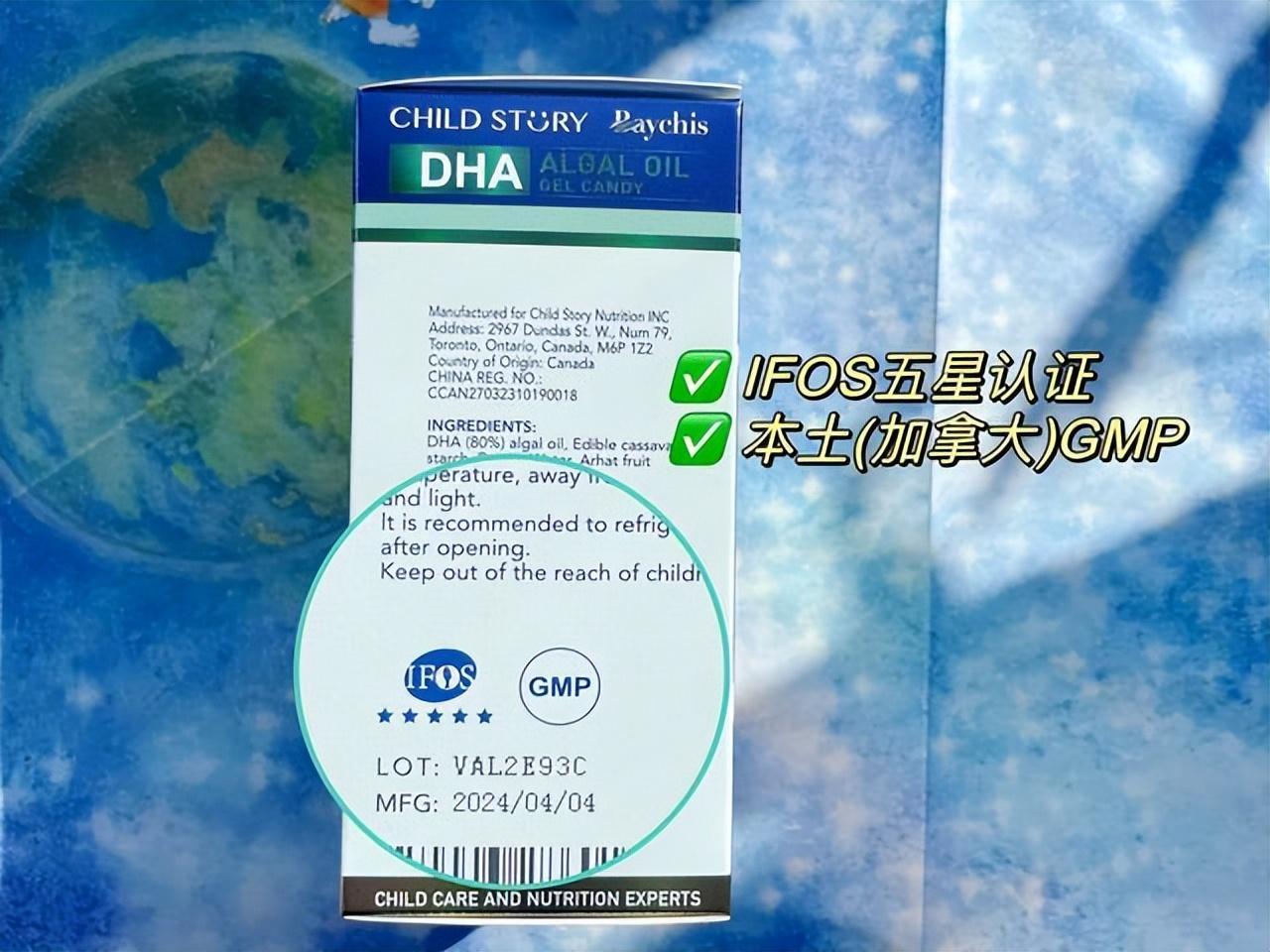 童年故事倍啓智DHA藻油凝膠糖果,原料嚴選的是天然單細胞海藻,並且通過了IFOS五星認證(全球公認的含金量最高的第三方魚油認證,包括含量值、純淨度、新鮮度、無害性、穩定性方面檢測)、本土國(加拿大)GMP認證,品質保障方面,媽媽們是大可以放心的~