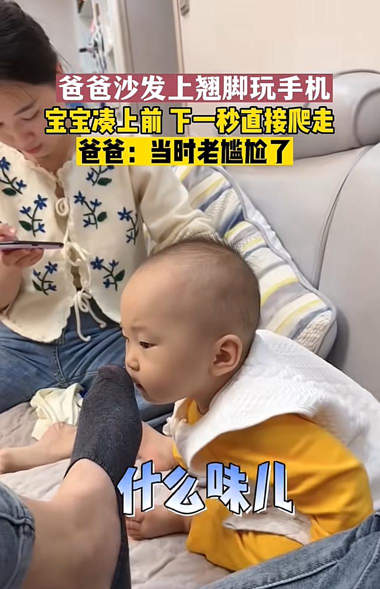 大連一個爸爸晚上回家的時候坐在沙發上把自己的腳翹起來,剛好一歲多的孩子站起來,正好碰到爸爸的大腳丫。