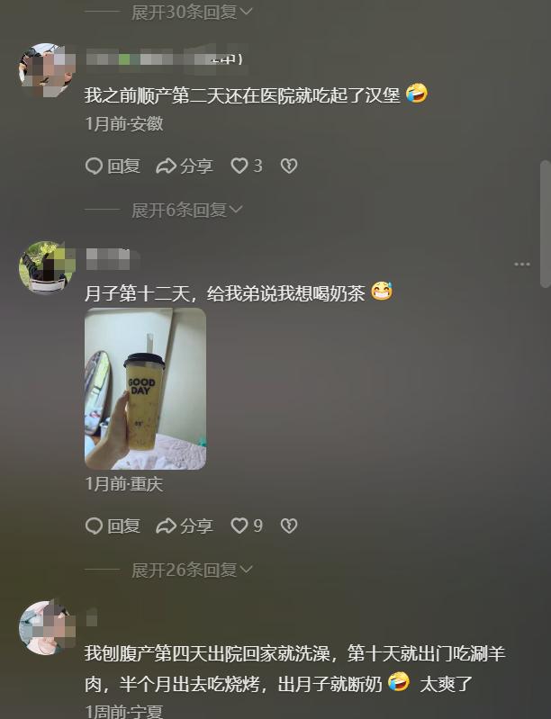 很多媽媽看到這裏都提起自己其實生了孩子之後坐月子確實會有想喫東西的時候,有媽媽說自己第10天出門喫涮羊肉,半個月出去喫燒烤。還有媽媽說自己的老公給自己偷渡回來各種漢堡包烤腸,還有宵夜。
