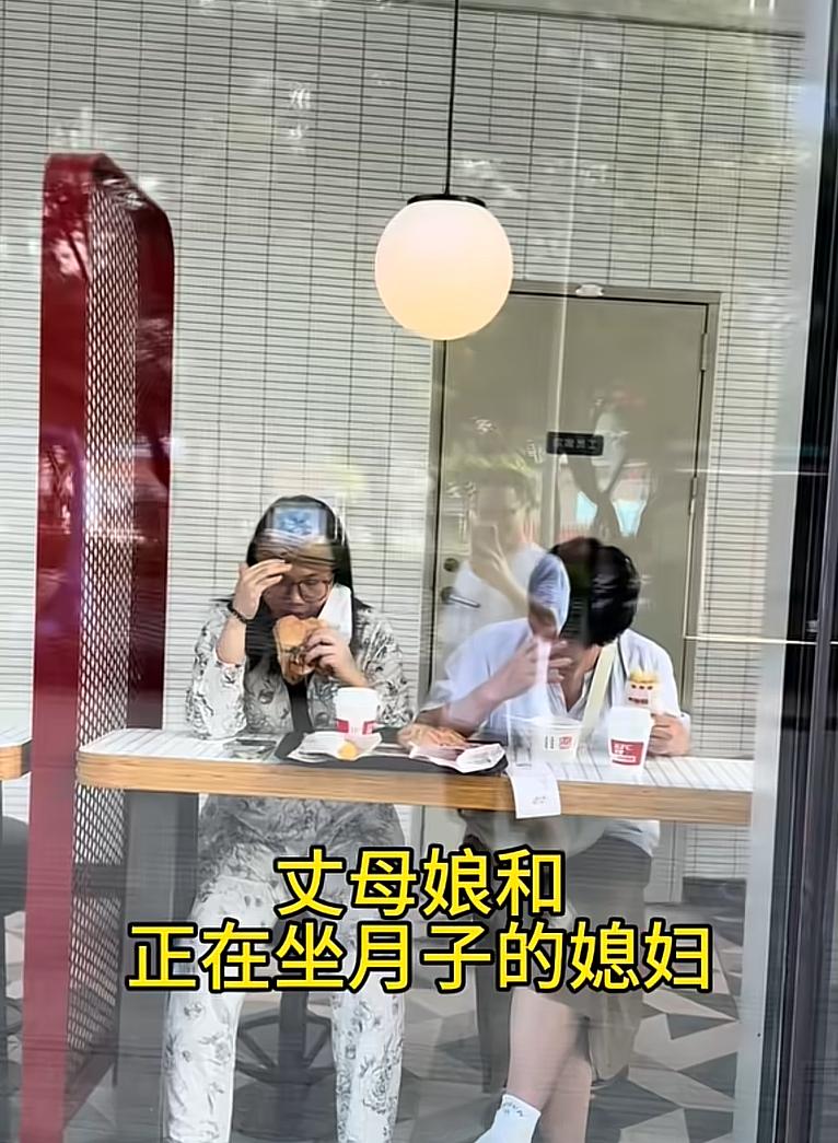 本來就是偷偷摸摸出來喫漢堡的,媽媽和孩子的姥姥畢竟“做賊心虛”,特別是孩子的姥姥,一邊喫還一邊髒話,結果眼角就撇到自己的女婿拿着個手機走了過來,丈母孃趕緊用手肘碰了一下女兒的手肘,接着兩母女動作神同步地悄悄地用手蓋住自己的臉低下頭。
