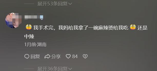 一個網友說:剛手術完,我媽就給我拿了一把麻辣燙給我喫,還是中辣的。