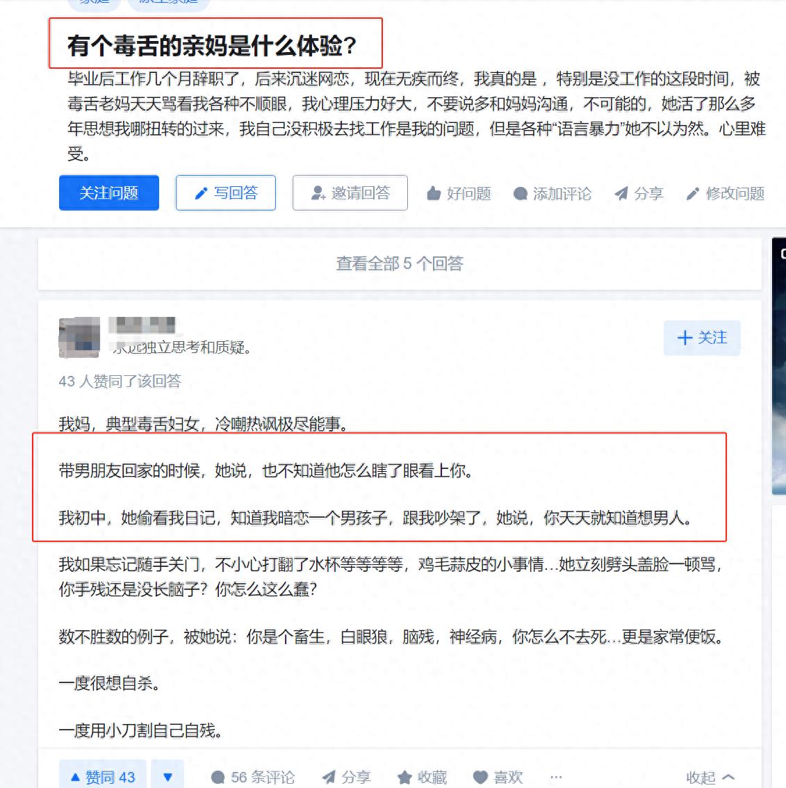 一網友提供了自己親媽的典型案例:帶男朋友回家的時候,她說也不知道他怎麼瞎了眼看上你?初中的時候自己暗戀一個男孩子,寫在日記裏被媽媽看到了,媽媽就說:你天天就知道想男人,他的媽媽經常罵他,你就是個白眼狼,腦殘,精神病……所以這個網友一度想要自殺。