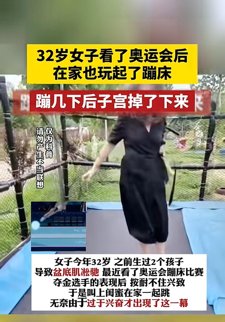 而醫生也非常的無奈,像小鳳這樣的情況,也不是鳳毛麟角,之前有一個32歲的二胎媽媽,在看完奧運會之後也在家裏面跳起了蹦牀,結果蹦了幾下子宮就掉下來了。
