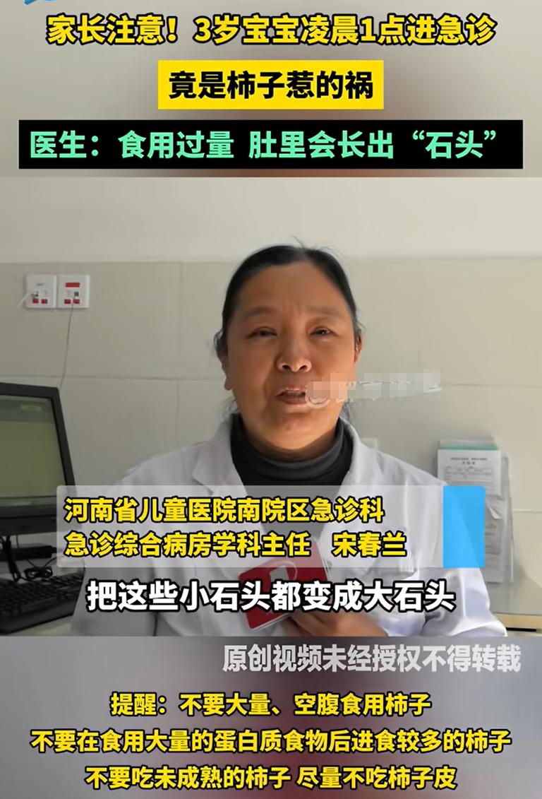 河南省兒童醫院急診科在半夜接診了一個三歲的孩子,孩子送到醫院的時候表情痛苦,家長說孩子已經嘔吐了三次,現在就是肚子非常疼。醫生當然就是問家長們給孩子喫了什麼?而家長就想到昨天晚上準備睡覺的時候給孩子喫了一個柿子,醫生頓時找到了原因。