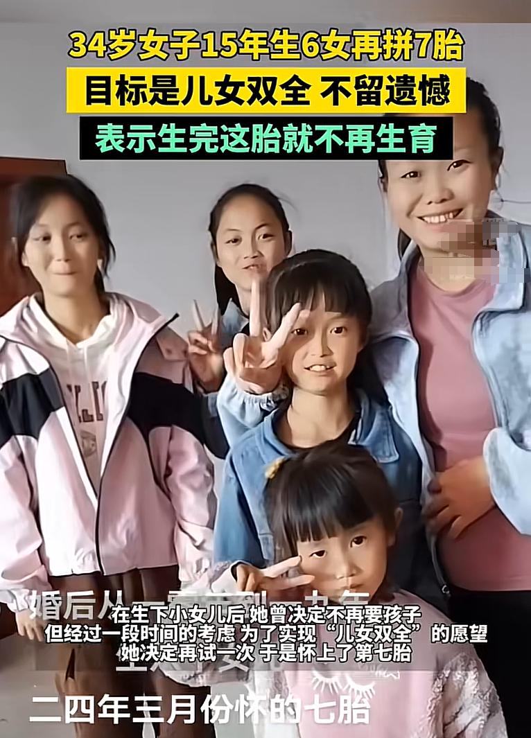 從2011年一直生到2019年,生下了6個女兒之後,因爲孩子還小要照顧孩子,可能也因爲其他的原因,於是就專心的工作,帶着6個女兒。但是到了2024年,估計是還不甘心,總是想要兒女雙全,所以又懷上了第7胎!