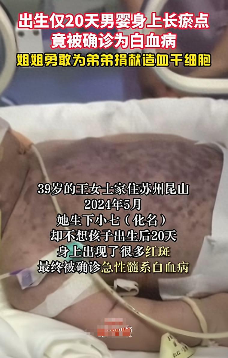 幸運的是白血病如果早發現的話,治癒率還是蠻高的,可以通過化療或者是骨髓移植。蘇州一個39歲的寶媽生下兒子沒幾天,就發現兒子全身長滿了紅斑,然後去醫院檢查,醫生說是白血病,整個家都瞬間像天崩了一樣。