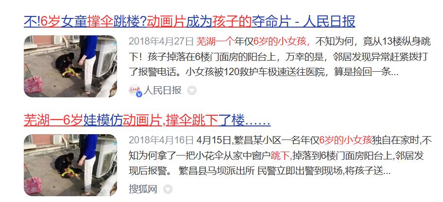 新聞上屢屢看到兒童模仿動畫片導致悲劇的發生。2018年,安徽蕪湖一個小區裏面6歲的女孩撐着傘從6樓跳下,原來孩子是受動畫片的影響,覺得拿起傘她也能飛翔。