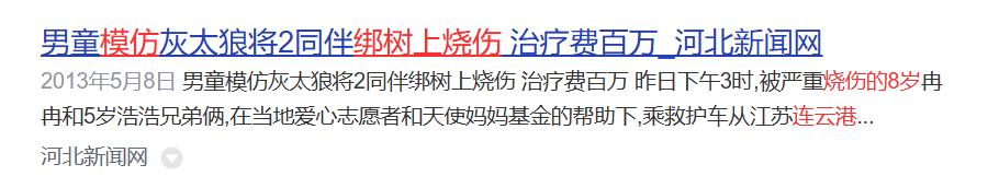 2013年連雲港一個8歲的男孩模仿動畫片綁架烤羊,把兩個小夥伴綁在樹上點火造成燒傷。