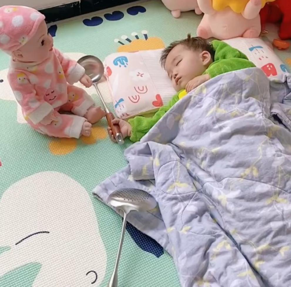 回到家裏面媽媽幫他把牀上的被子鋪好了,他就逗着娃娃玩,放進電池打開之後娃娃會自己走,還會眨眼睛,還會跳舞。