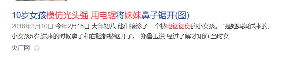 2016年陝西漢中一個姐姐模仿光頭強使用電鋸的樣子,把妹妹的臉鋸傷。