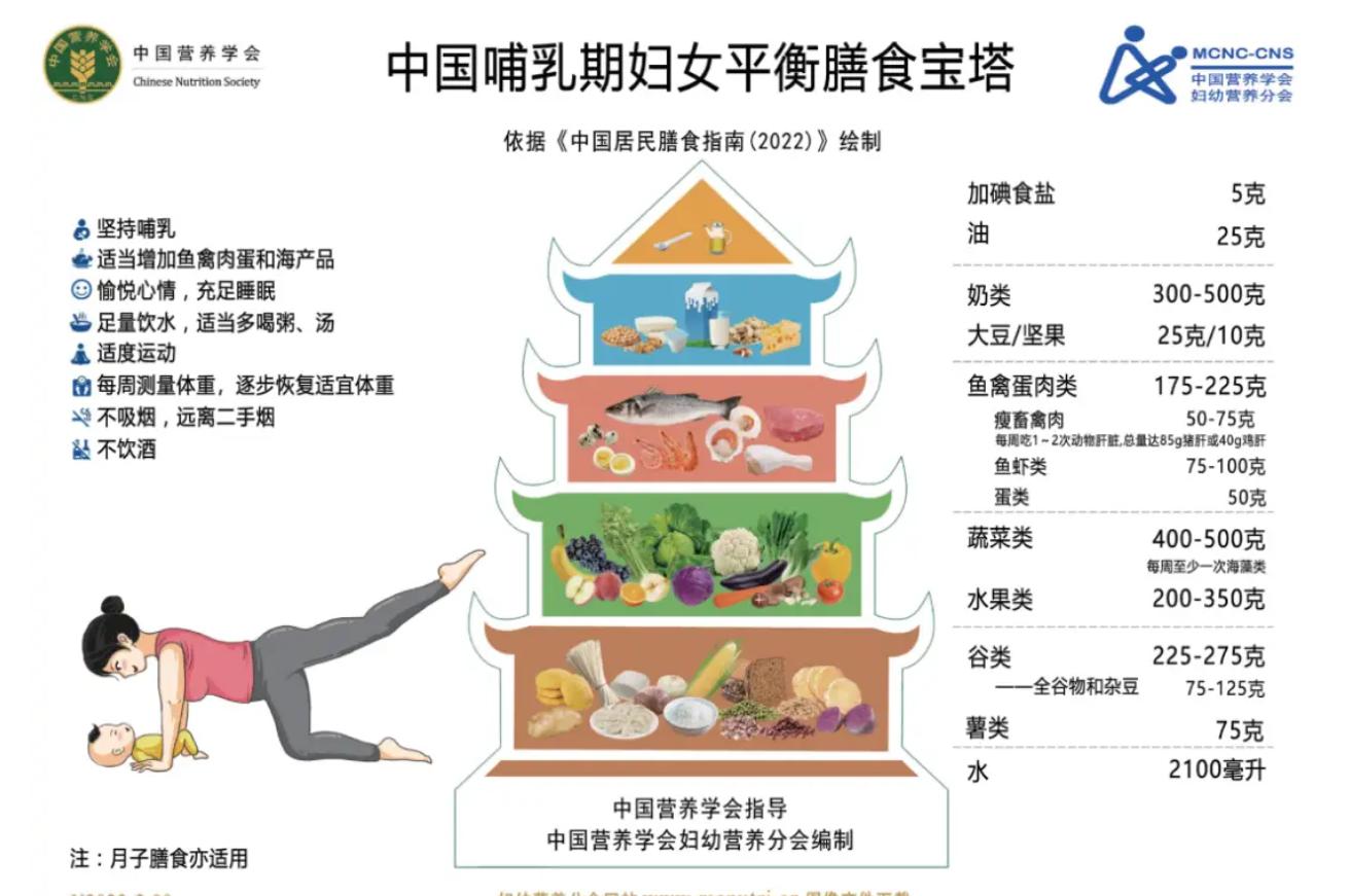 所以媽媽在哺乳期的時候要營養均衡,至於怎麼喫可以參照《中國哺乳期婦女平衡膳食寶塔》。
