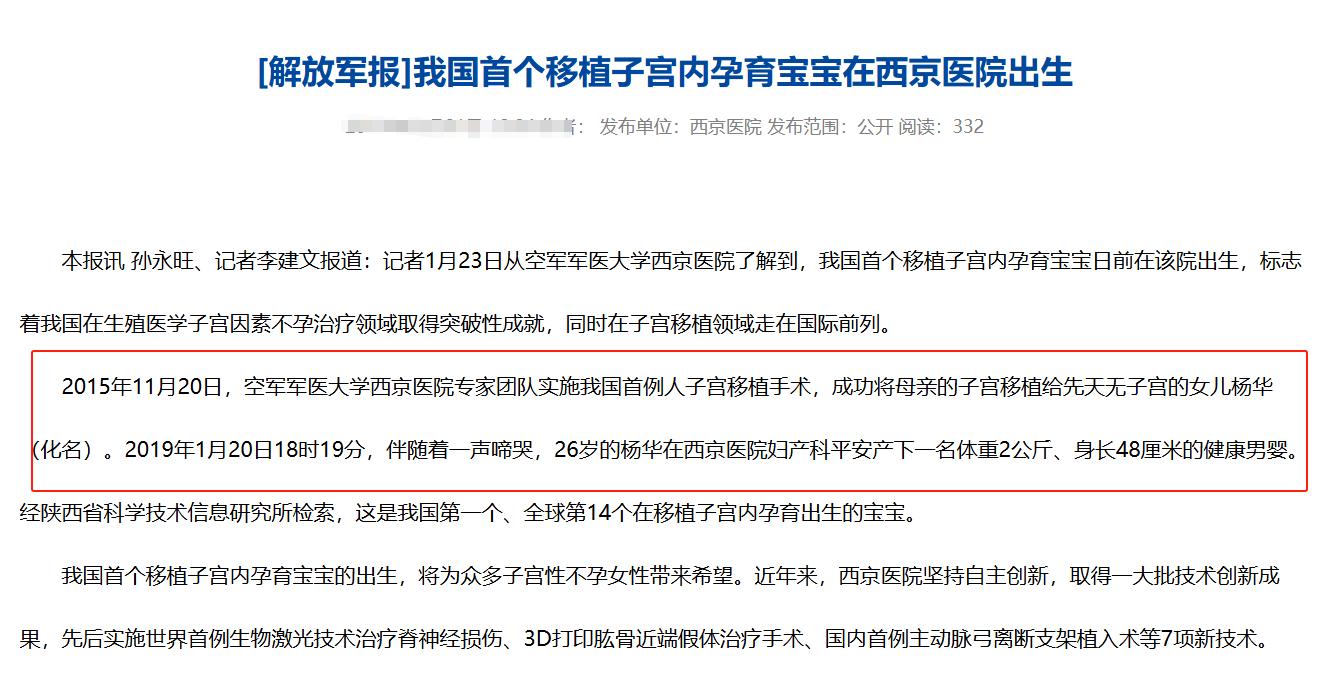這是中國第1個,全球第14個在移植子宮中孕育出生的寶寶。也就是這個孩子雖然是在媽媽的身體裏面長大的,但是媽媽身體裏面的這個子宮其實是外婆的。