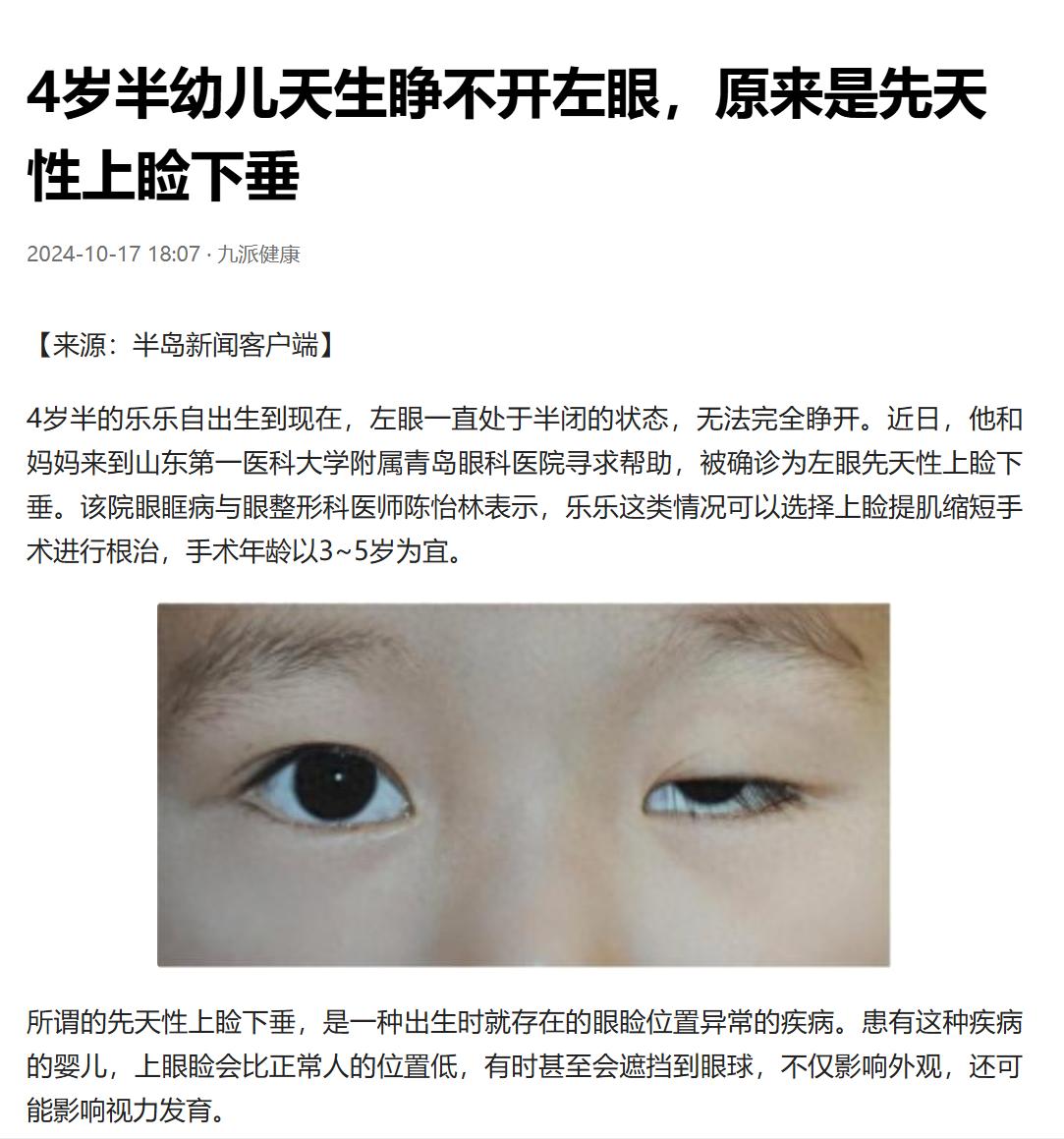 而這個孩子在小的時候一直被父母用膠帶把孩子的上眼瞼粘連起來,只有粘連起來的時候孩子眼睛才能睜開一點點,但是看來也非常的彆扭,後來還是動手術孩子的眼睛才能睜開。