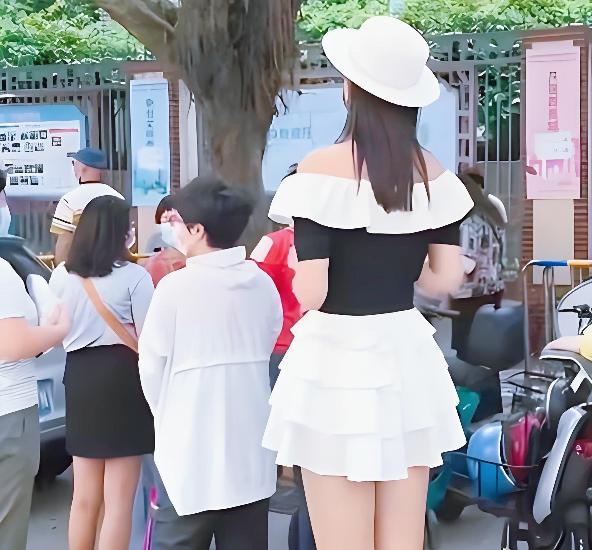 校門口許多是奶奶接娃,幾個大媽議論了起來:“她在大庭廣衆之下穿成這樣,真沒一點羞恥心呀!”