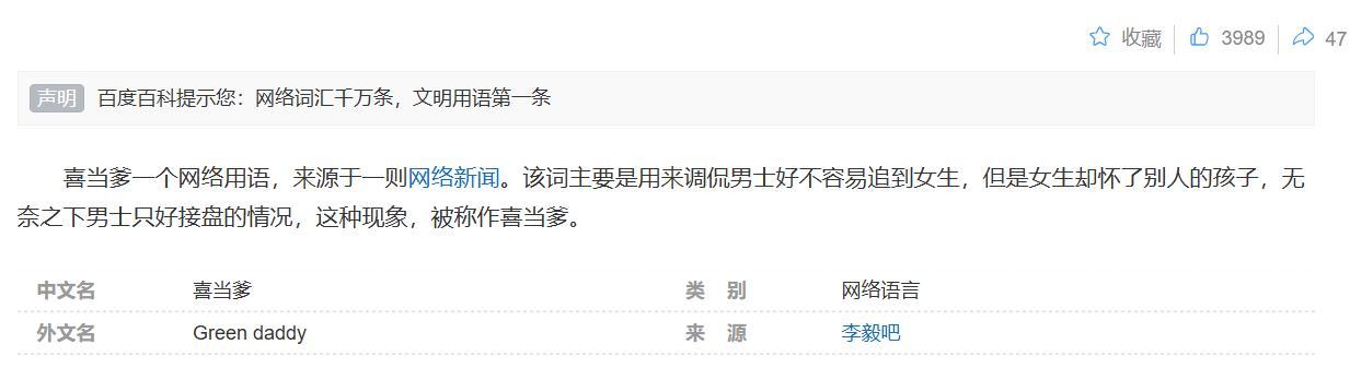 “喜當爹”其實是一個網絡詞語,一個男孩子好不容易追到了自己喜歡的女生,但是這個女生卻懷了別人的孩子,無奈之下這個男士只好做了接盤俠喜當爹。也就是自己還沒有出任何的力氣就當上爹了,毫不費勁當上了爹,這其實是一種諷刺的方式,也就是自己已經頭上一片草原了。