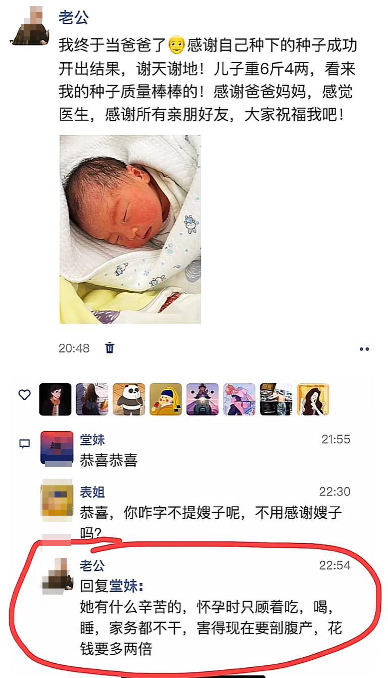 後來朋友圈裏面的好友就說:怎麼不提嫂子呢?不是要感謝嫂子嗎?這個低情商的奶爸卻說:她有什麼辛苦的,懷孕時只顧着喫,喝,睡,家務也不幹,害得現在要剖腹產,花的錢都要多兩倍……