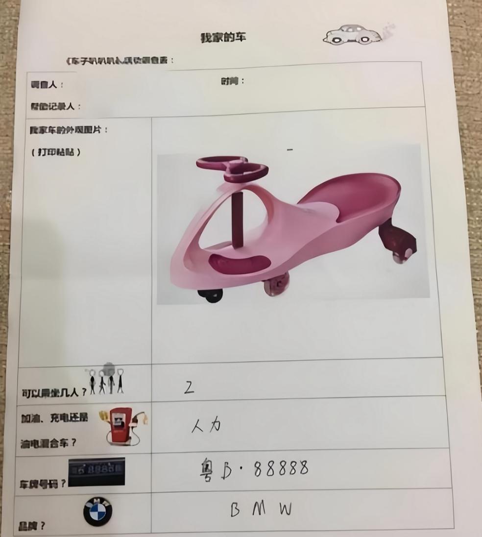 家裏面開的是什麼車?有一些學校會隱晦地讓孩子把家裏面車的車標給開畫出來,比如說你家的車標是寶馬還是奔馳?還是普通的本田或者是比亞迪等等,就讓孩子把自己家裏面用的車的車標畫出來。