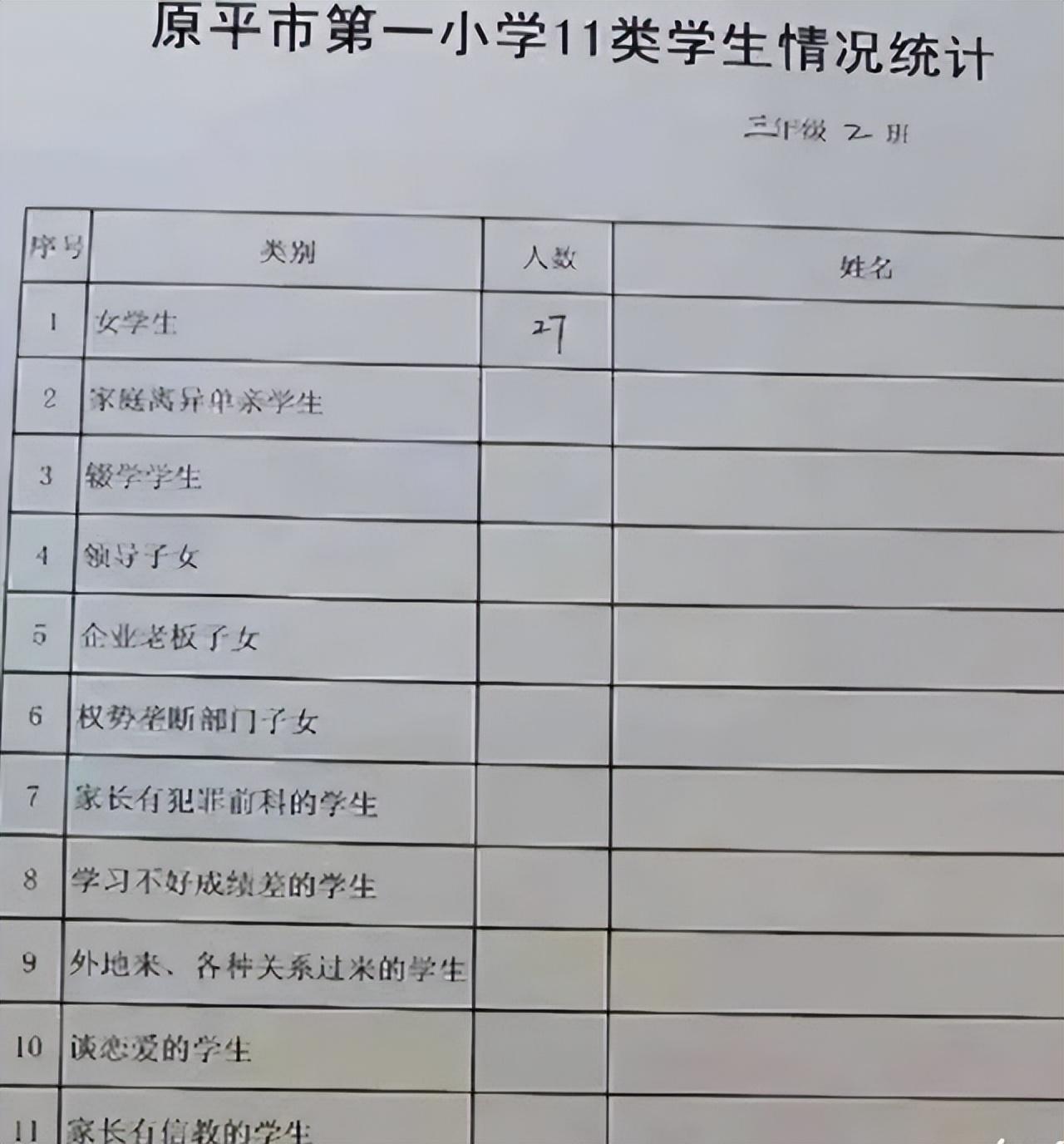 之前山西有一小學的班主任,在統計學生家庭背景的時候,就把孩子的家庭背景分爲了11類。