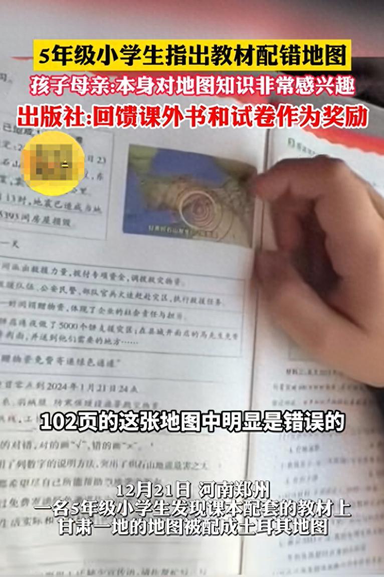河南鄭州有一個五年級的孩子在看課本配套的教材的時候發現有一張地圖是錯誤的,配圖的時候說是甘肅的地圖,但是他看到上面的地圖明明就是土耳其的地圖,也就是張冠李戴了,把土耳其的地圖放在甘肅地圖的上面。