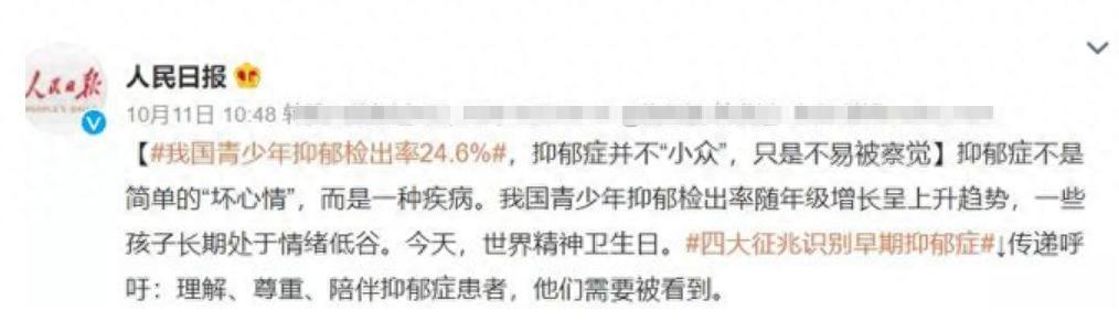人民日報公佈了一組數據:我們國家青少年抑鬱檢出率高達24.6%!