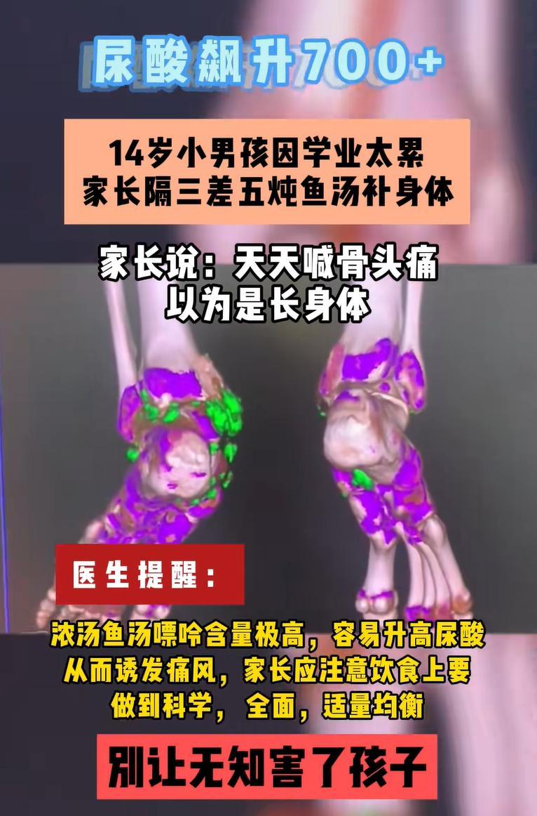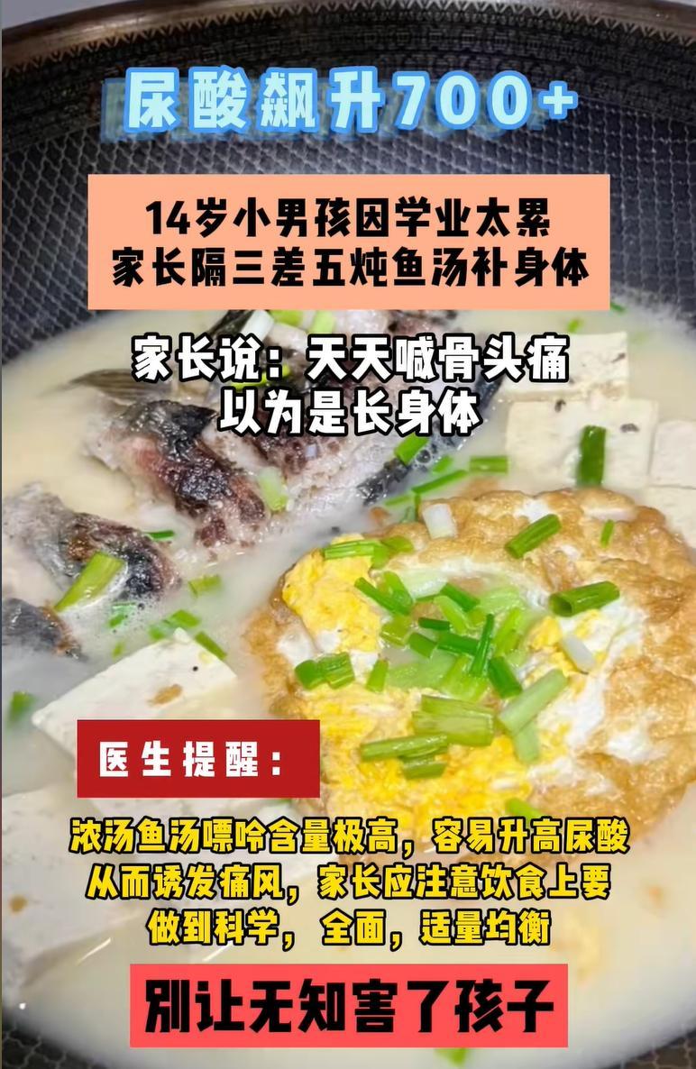 一個14歲的男孩子上初中學業壓力非常的大,再加上孩子正要長身體,經常跟父母說自己的骨頭疼,父母就覺得孩子缺營養了,缺鈣了,在父母看來魚湯骨頭湯是非常有營養的一種食物,覺得無論是骨頭湯還是魚湯燉出來之後都是白色的,裏面的鈣含量應該也挺高的,所以隔三差五地給孩子燉魚湯。