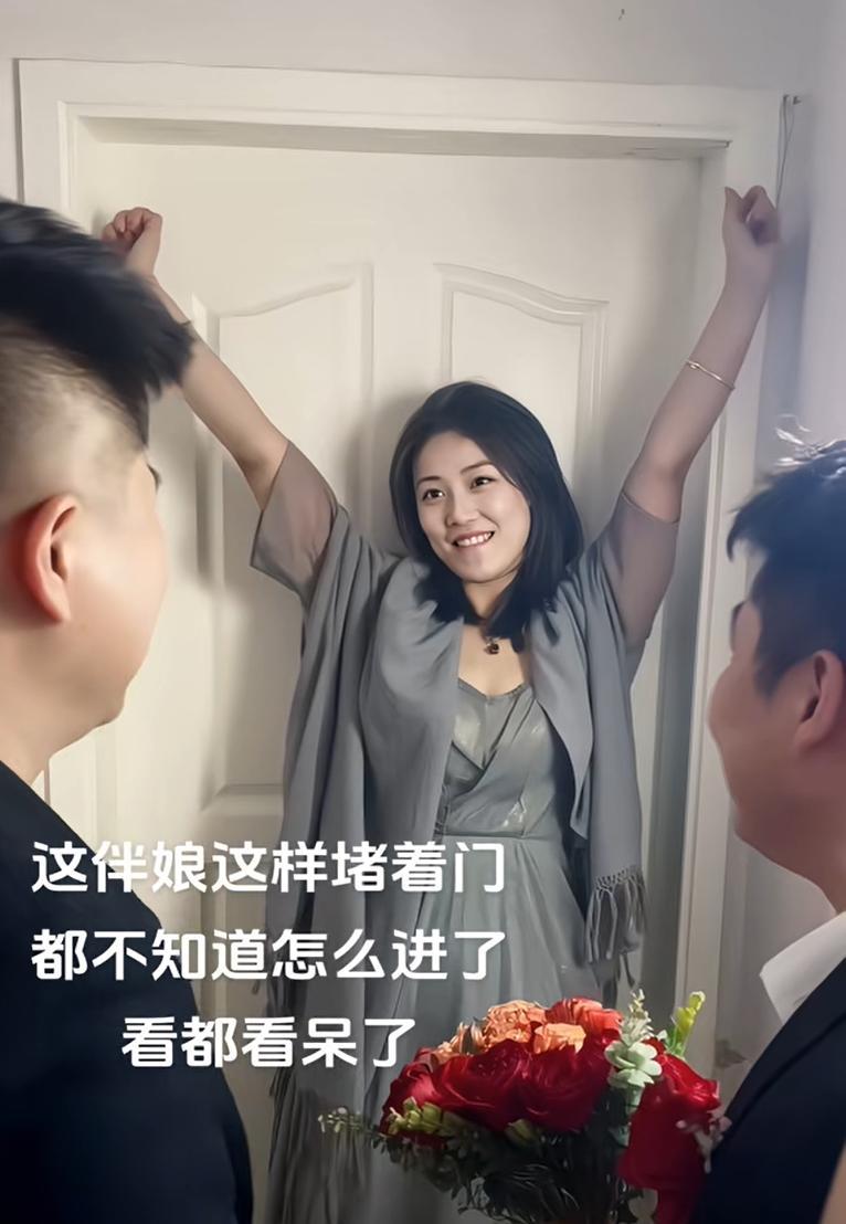 但就是這樣外表並不是說絕美,而且打扮也沒有很誇張的伴娘出現在新娘的門口時,卻讓新郎和伴郎們不敢再向前一步,這個伴娘可以說是一夫當關,萬夫莫開。