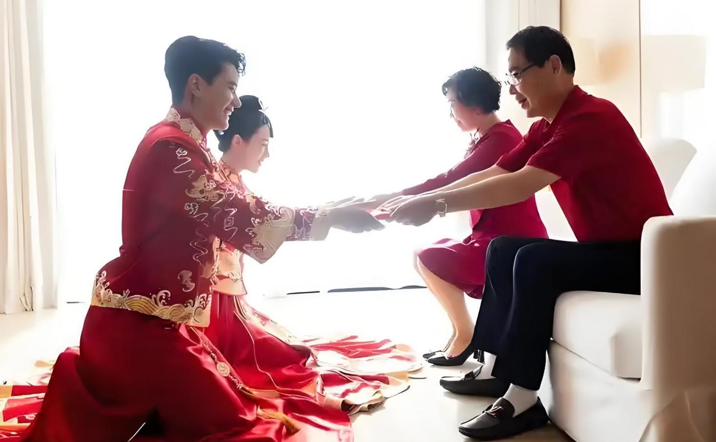 一般在接親的時候,新郎要向新娘的父母敬茶,感謝養育之恩。