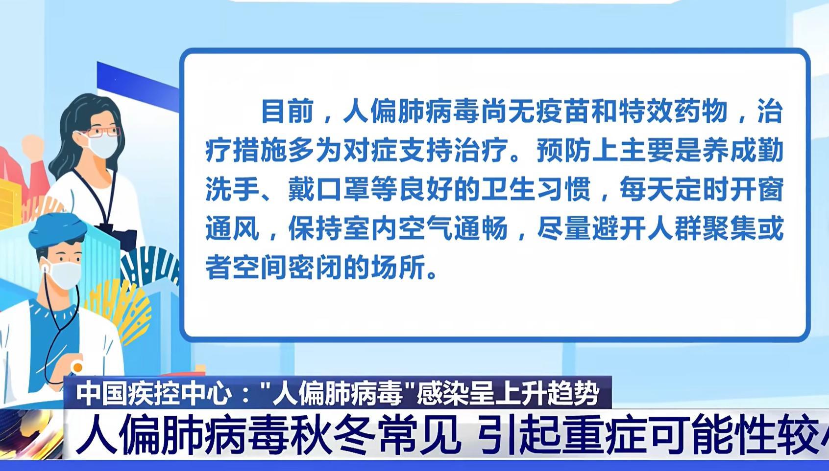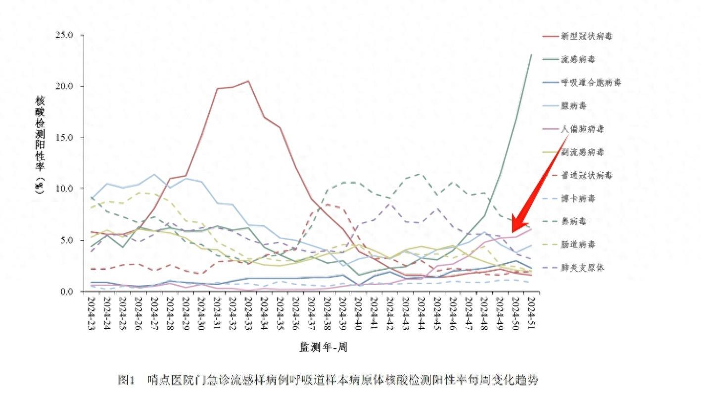 中國疾病預防控制中心發佈的《全國急性呼吸道傳染病哨點監測情況(2024年第51周)》發現:人偏肺病毒(HMPV)在門診和住院患者中陽性率連續六週上升。