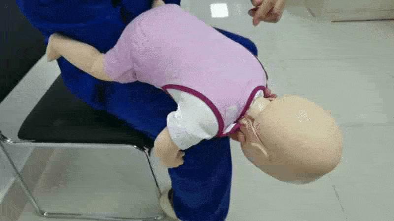 就像浩浩這樣還沒到一歲的小嬰兒,看到這個動圖,首先是讓嬰兒面朝下放在前臂,用手托住嬰兒的頭和下顎骨,另外一隻手在嬰兒背部兩側肩胛骨之間連續5次的拍擊,斜向下的用力。