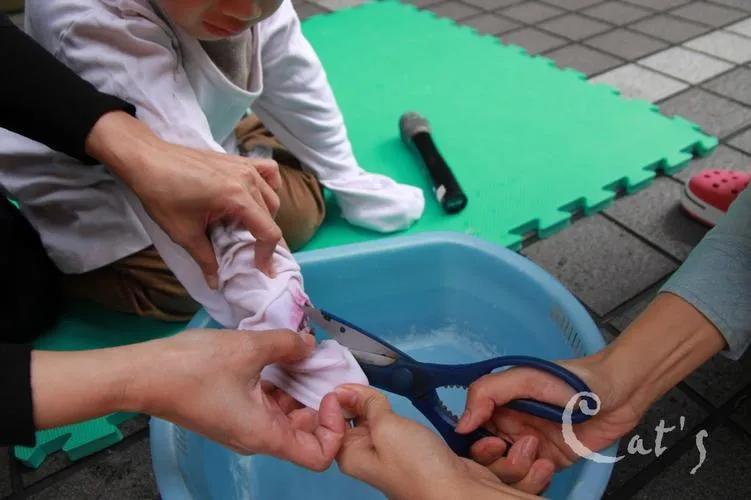 第2步脫爲什麼要這麼慎重呢?因爲孩子被燙傷的部位有衣服蓋住的話可能衣服會跟傷口上黏在一起,所以我們用剪刀沿着完好的皮膚和被燙傷的皮膚剪一條線,把衣服剪掉,避免造成孩子傷口的二次燙傷。