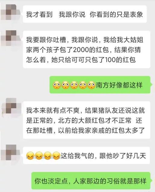 就在夫妻倆爭吵不休的時候,小佳突然想起了一個南方朋友的經歷。那位南方朋友曾經來東北過年,給親戚家孩子包了100元的紅包,結果對方回禮直接給了1000元。朋友當時也尷尬得不行,覺得自己太小氣了。小佳心想:“這南北習俗的差異,真是讓人頭疼啊!”