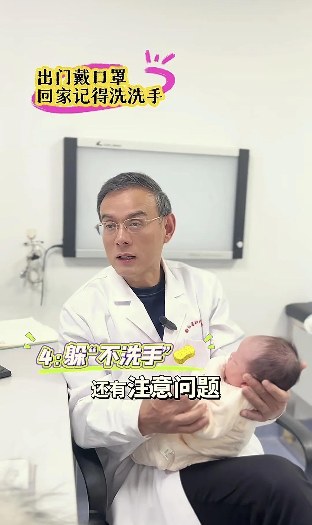 而爸爸媽媽出門的時候也要注意戴口罩,在抱孩子之前脫掉口罩,洗一把臉,洗乾淨手,然後把外套這些給脫了,最好是換上衣服再接觸孩子,儘量避免身上的病菌傳給孩子。