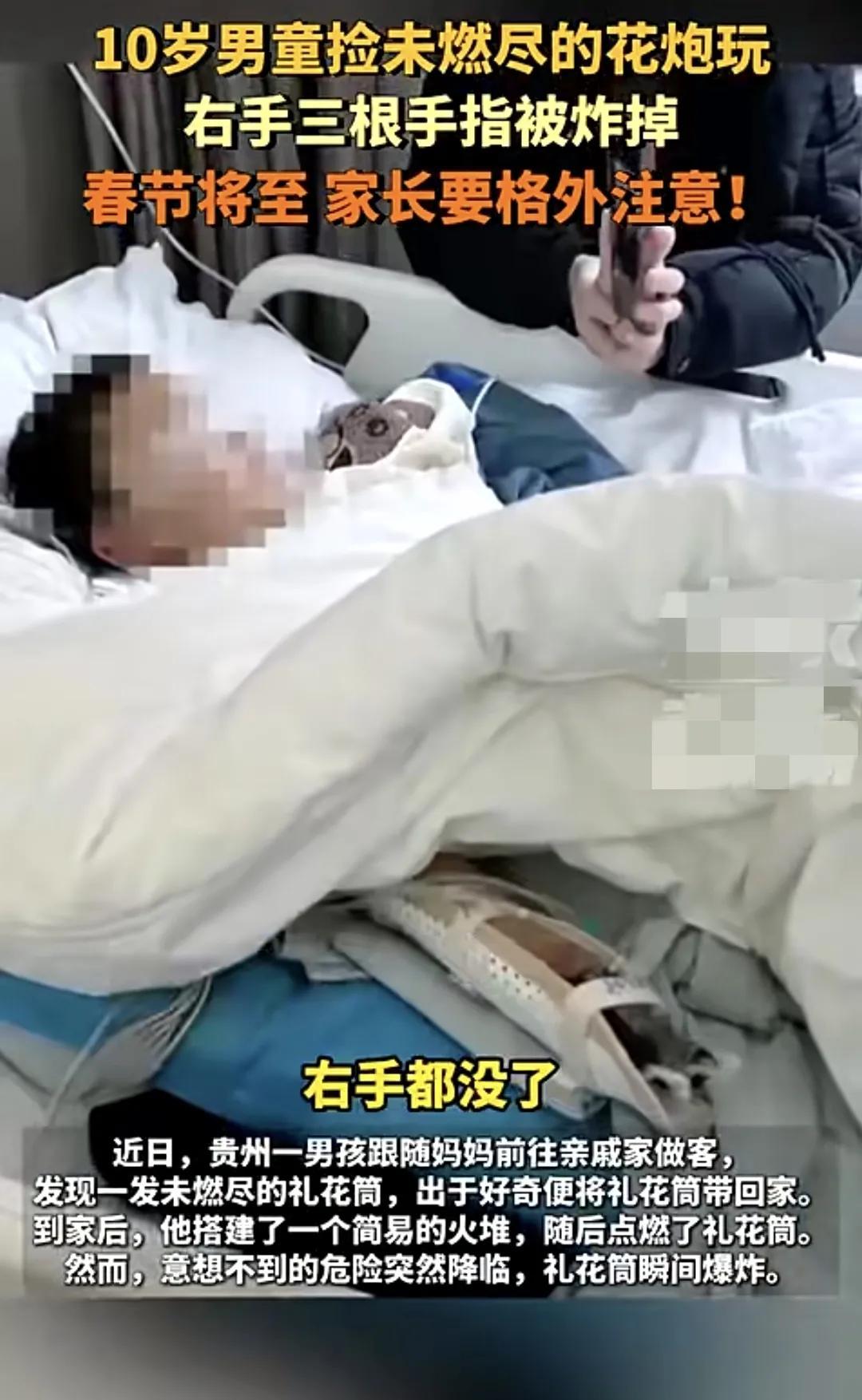 貴州畢節一個10歲的男孩撿一個小禮花筒回家,結果點燃的時候禮花瞬間爆炸,小男孩的右手幾個手指直接就要廢了,去醫院的時候醫生說拇指還可以,小手指也勉強能夠保住,但是右手後面的三根手指就廢掉了。