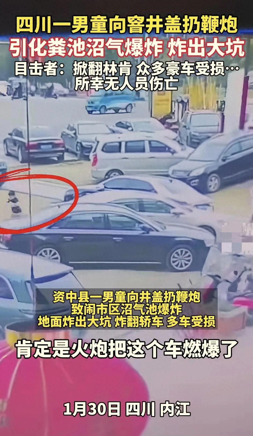 大年初二,四川內江一個停車場的監控視頻裏,一個孩子開開心心地到停車場裏面,直接把一個鞭炮扔到了兩輛車中間的一個地下化糞池。
