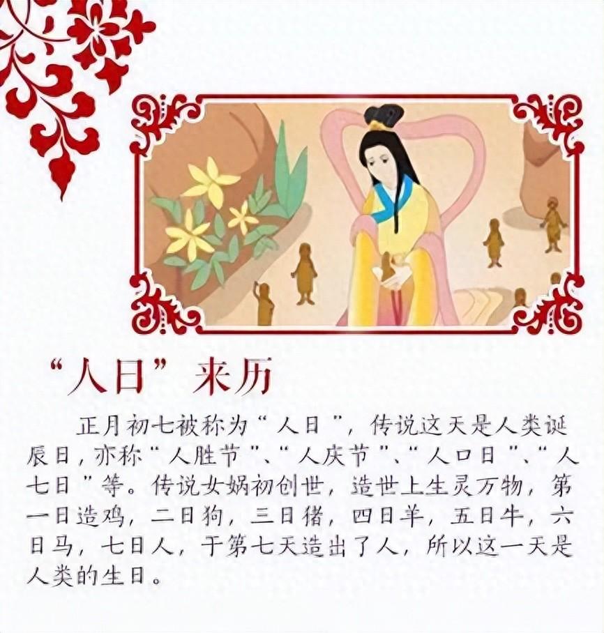 爲什麼叫人日呢?原來傳說中女媧創造生物萬靈的時候先創造的是六畜,雞狗豬羊牛馬是首先創造出來的,第7天才創造了人,所以正月初七是人的誕辰日。