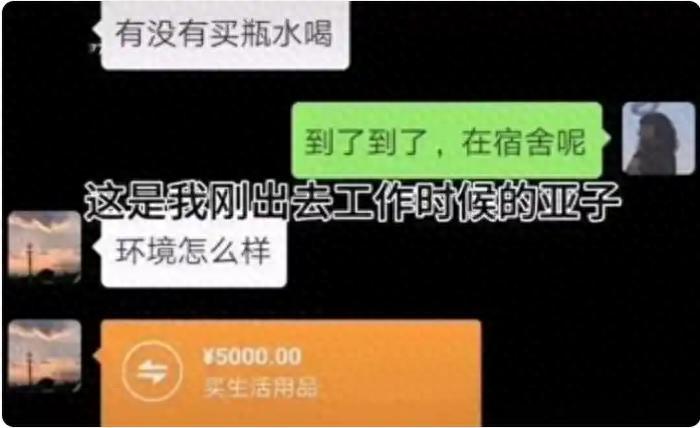 當女兒到宿舍後,第一時間向爸爸報平安時,爸爸的回覆迅速又暖心。先是詢問宿舍環境,緊接着毫不猶豫地轉了5000元,留言道:“買點生活用品,別委屈自己。”