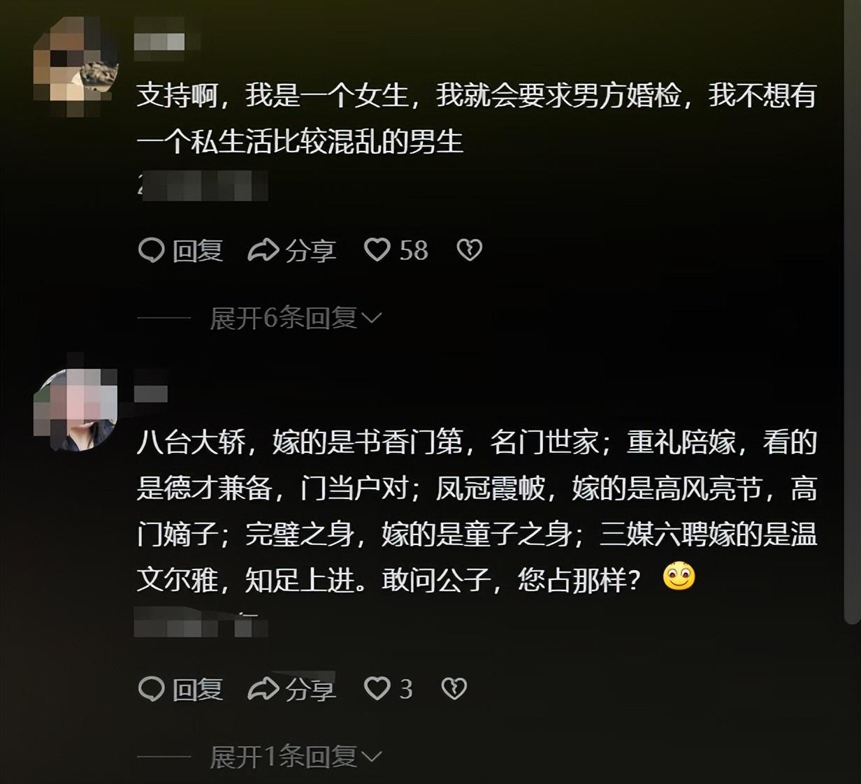 這個博主的意思就是說,你要求女方是處女,那你必須也要是處男,這其實彩禮也是一樣的,現在很多彩禮其實跟嫁妝是一樣的,也就是男方給多少彩禮,女方就要準備多少嫁妝。