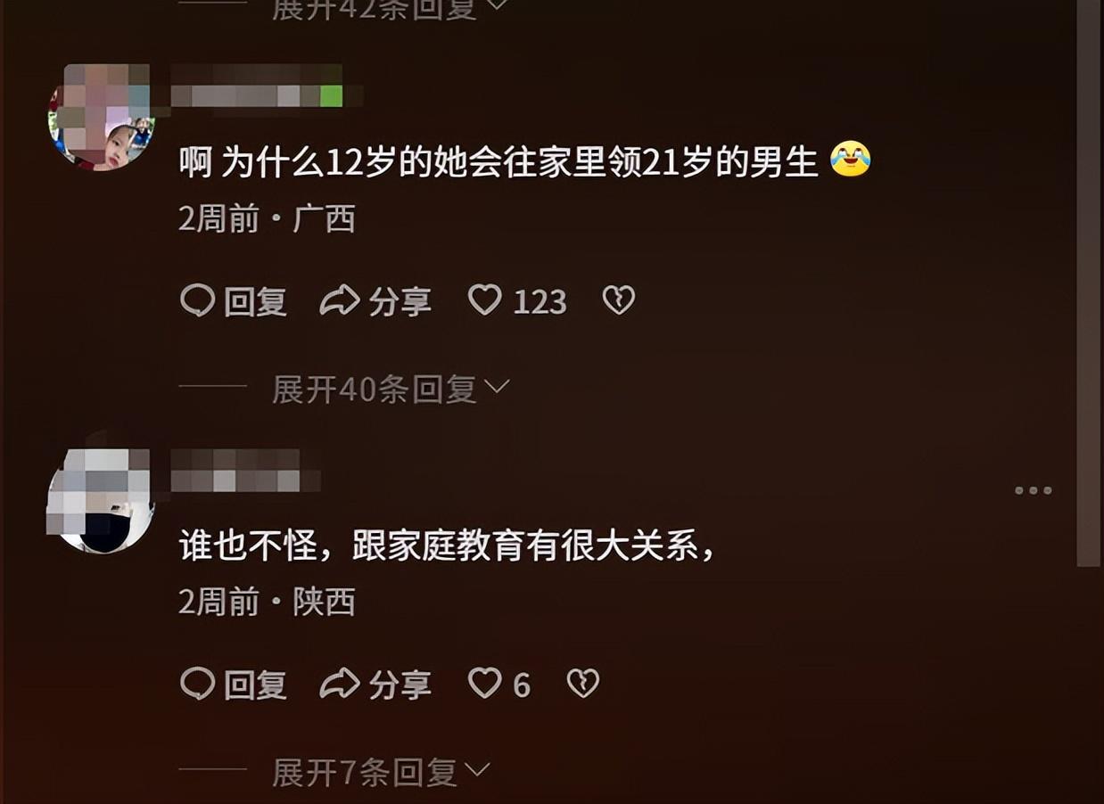 甚至有很多網友說,現在的女孩子都不自愛,還有些十三四歲的抽菸喝酒的。網友的潛臺詞就是,你12歲把一個21歲的男人帶回家,這不是活該嗎?
