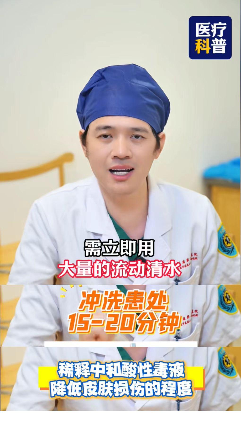 而且這個沖洗的時間儘可能快一點,因爲我們皮膚本身是有保護屏障的,這時候剛剛接觸酸性液體的時候是沒有那麼快灼傷的,所以沖洗快的話對皮膚的負面影響就會小很多。