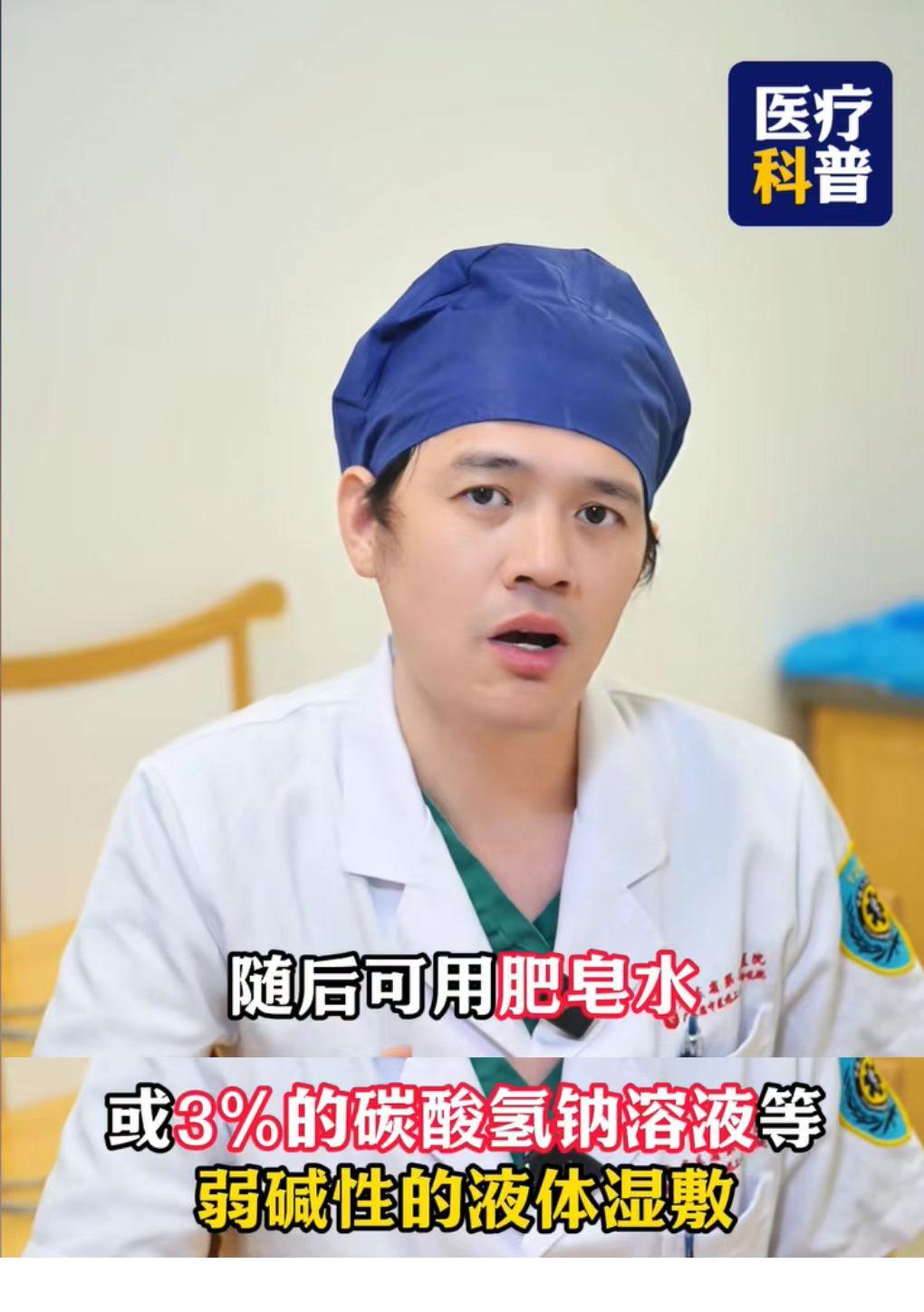 沖洗完之後還要用肥皂水或者是3%的碳酸氫鈉溶液等這些弱鹼性的液體來溼敷。雖然我們沖洗了,但是皮膚癢,表面可能還殘留了一些酸性的液體,這時候我們就要用弱鹼性的液體來中和,可以大大地減少酸性對皮膚的傷害。
