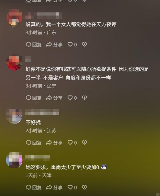 很多網友卻紛紛表示她在許願,因爲男生如果自己本科畢業長得高長得還不錯,其實也是可以靠自己的能力去賺錢的,即使說找老婆的話可能也會找一些相對來說有一點點顏值,或者說是脾氣比較好的女性。