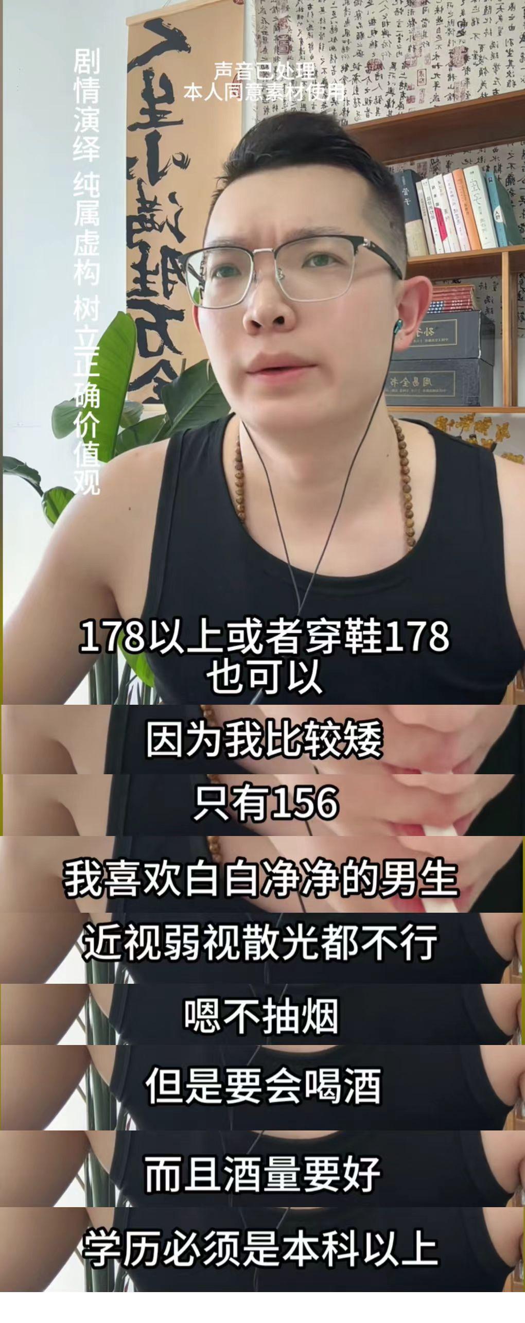 男生要白白淨淨的,而且要有腹肌,眼睛是健康的近視散光弱視都不行。這三個條件是因爲女孩子自己喜歡白淨的男生,有腹肌不戴眼鏡的男生。