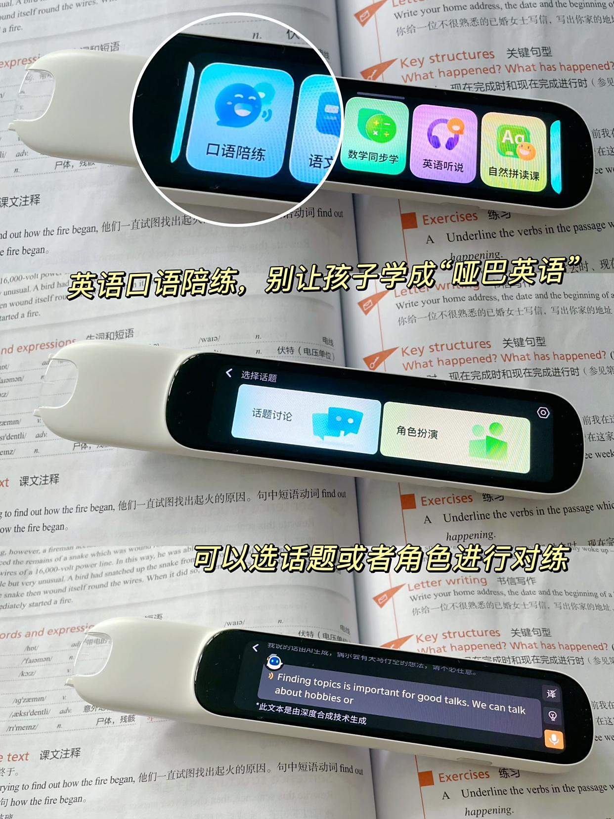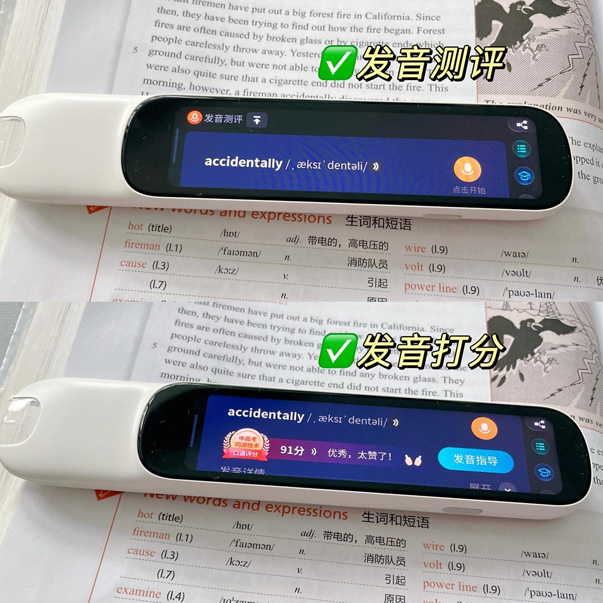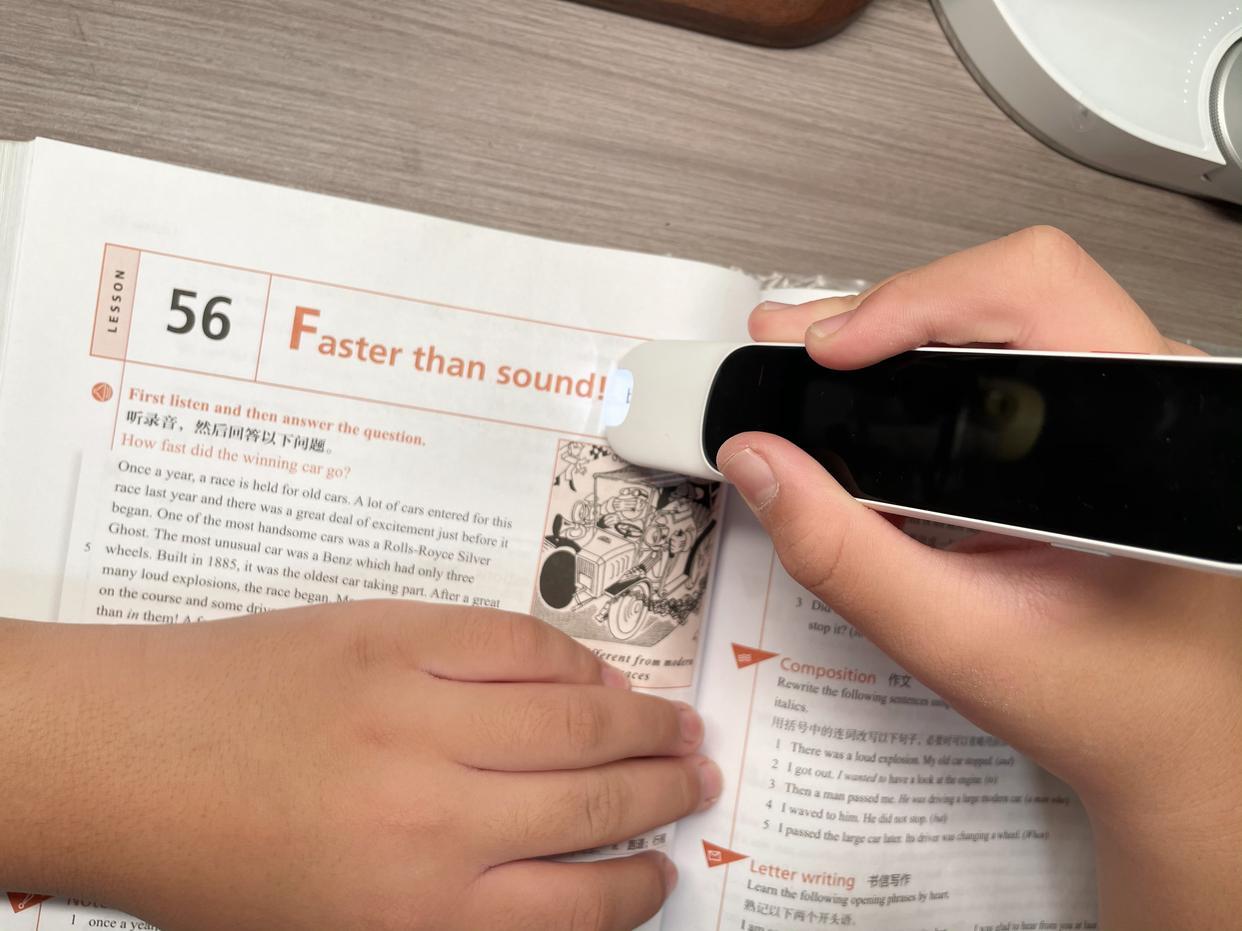 掃查時不限教材版本,孩子課本里的彩色文字也能精準的識別,比如預習第二天的英語課文,遇到不認識的單詞,用詞典筆一掃,能聽標準發音、聽自然拼讀,孩子跟讀還能給打分,看讀的標準不標準。