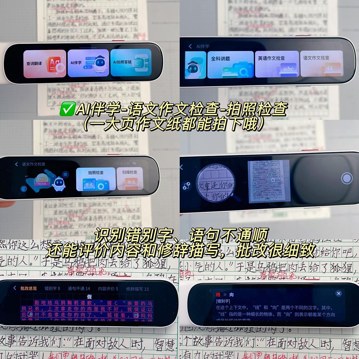 還有作文批改也很好用!我還專門用孩子的語文作文測試了下,在AI伴學裏,找到語文作文檢查,可以拍照也可以掃描,我選了拍照,確認後還可以手動框選,確保作文文字都在識別內容裏。
