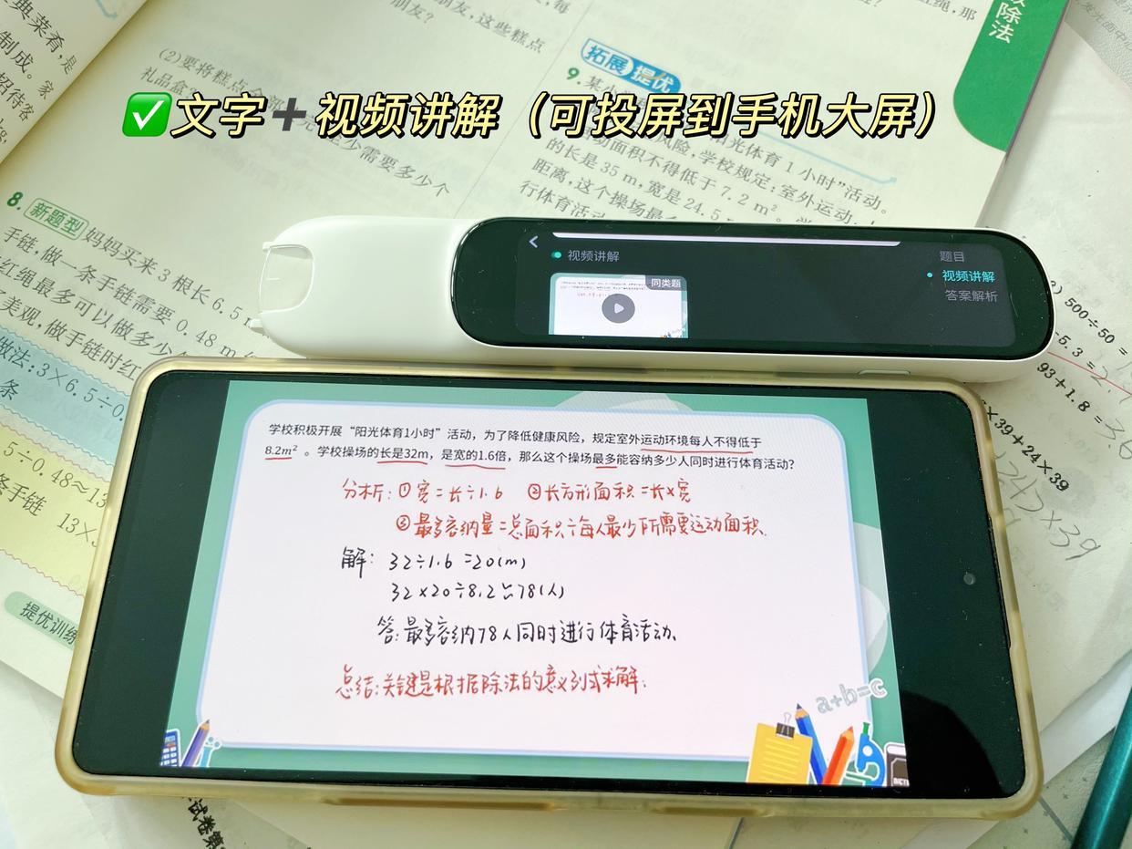 只需要孩子遇到不會的題,對着一拍,就能出來原題或者相似題的答案解析(系統默認不直接給答案,如果需要直接呈現答案,家長可以在APP裏設置),有文字解析思路,還有視頻精講知識點,視頻講解還能直接投屏到手機大屏看,細節設計的很貼心!