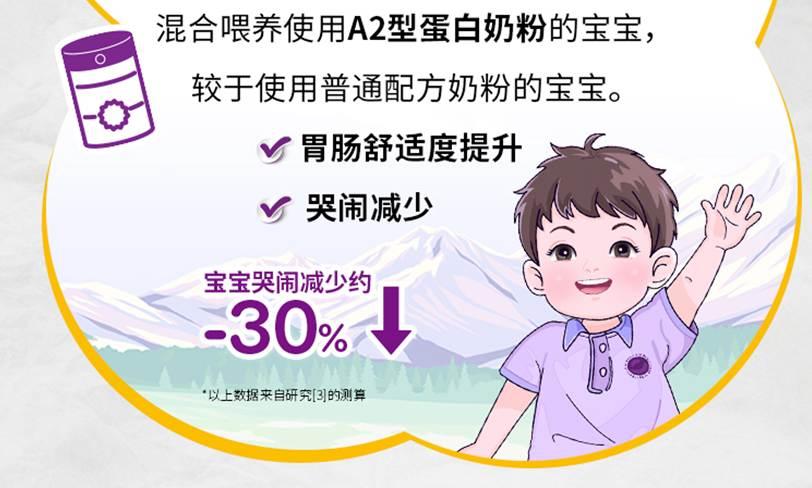 針對這點,官媒也科普道,母乳是嬰幼兒最理想的天然食物。若母乳不足或無法純母乳餵養,可選擇“混合餵養”,即母乳+配方奶粉的模式。另一項發佈在食品科學與營養領域專業學術期刊Food Science and Nutrition 的《不含A1型β-酪蛋白的嬰兒配方奶對生長髮育和舒適度的影響:一項隨機對照試驗》重要研究,顯示混合餵養使用僅含A2型蛋白的a2奶粉寶寶,較於使用普通奶粉的寶寶,胃腸舒適度更佳、哭鬧次數減少約30%。主導這個研究的上海交通大學醫學院附屬新華醫院發育行爲兒童保健科盛曉陽主任醫師也提示到:“在混合餵養的過程當中,媽媽們都要記得,除了我們要注意配方奶當中的營養成分跟母乳類似,同時還要注意配方奶當中的成分結構也要跟我們的母乳類似。”