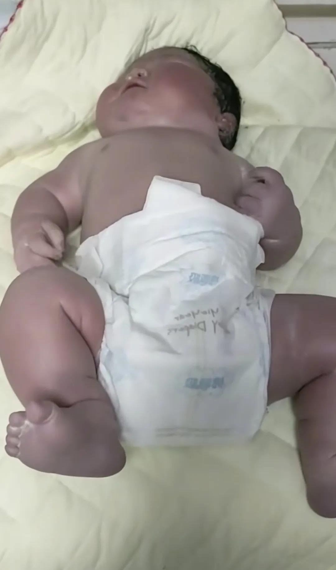 所以看這個新生兒是沒有脖子的,頭就跟身子連在一起了,手臂上的肉也是一節一節的,能看得出大腿也是非常的粗,穿着大號的尿不溼躺在牀上,壓根就看不出是新生兒,還以爲準備要半歲了。