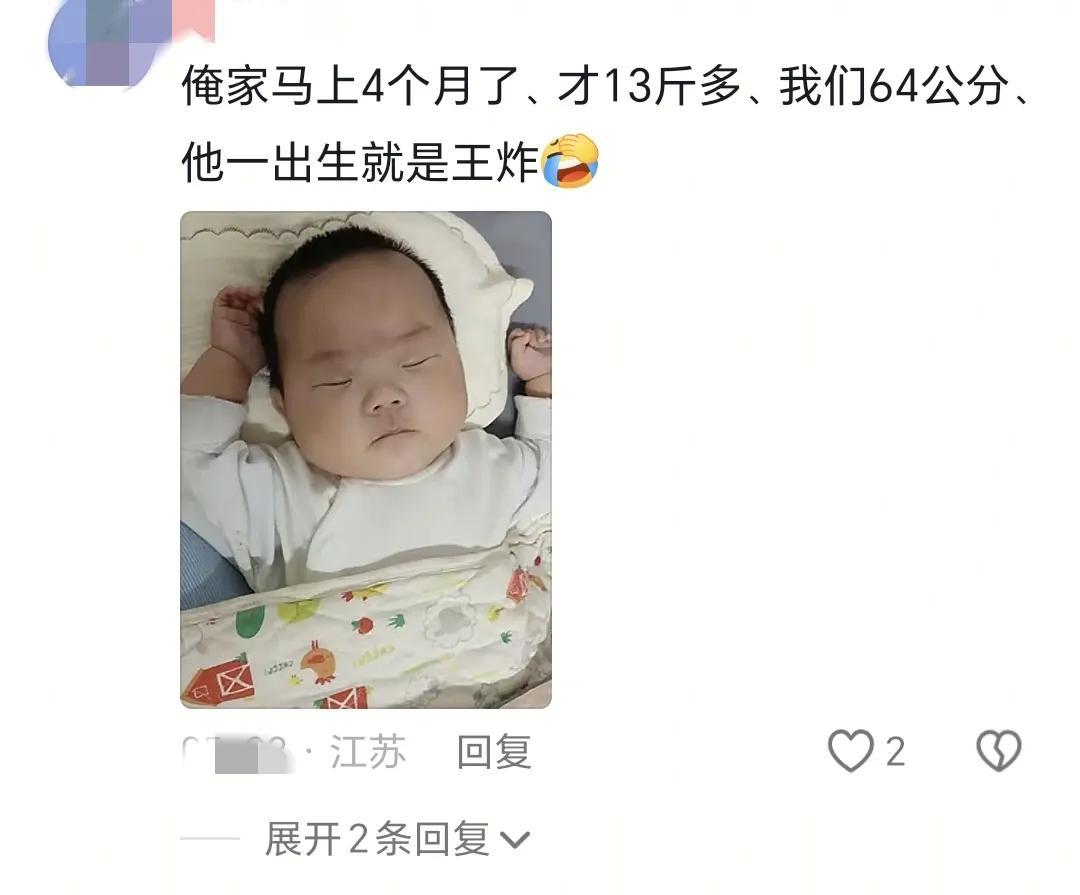 助產士說這是她接生過最大的娃,還有一個江蘇的網友說:自己家孩子馬上4個月了,才13斤多一點,64公分,而這個孩子一出生就是王炸……