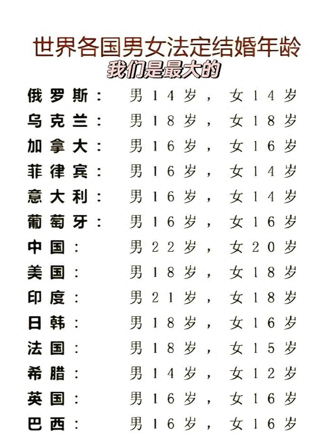 很多發達國家爲了讓人生更多的孩子就降低了結婚的年齡,比如說法國男的18歲就可以結婚,女的15歲。在英國巴西無論男女都是16歲結婚。結婚最晚的可以說是中國了,男的22歲結婚,女的20歲結婚,就是這樣的結婚年齡。
